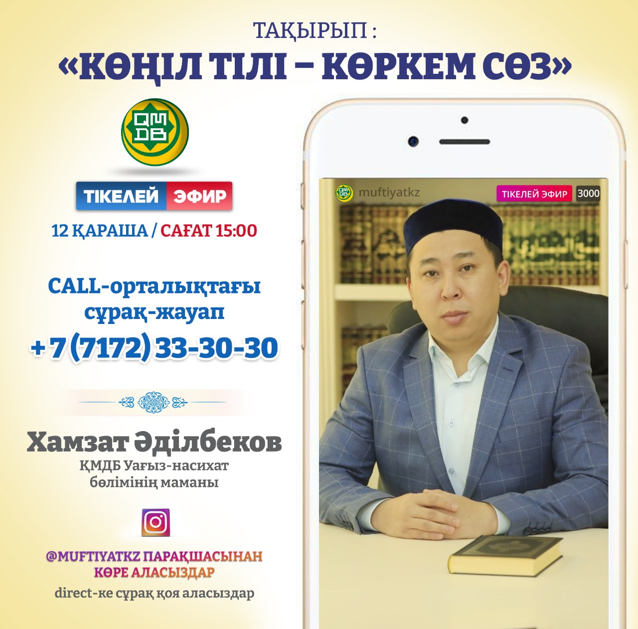 В честь «Недели культуры» вы сможете задать вопросы об этикете и культуре речи в прямом эфире на тему «Көңіл тілі – көркем сөз», позвонив в Религиозно-информационный центр по телефону +7 (7172) 33-30-30. А также можете посмотреть трансляцию на странице ДУМК @muftiyatkz в Instagram и задать вопросы в директ или в разделе комментариев.