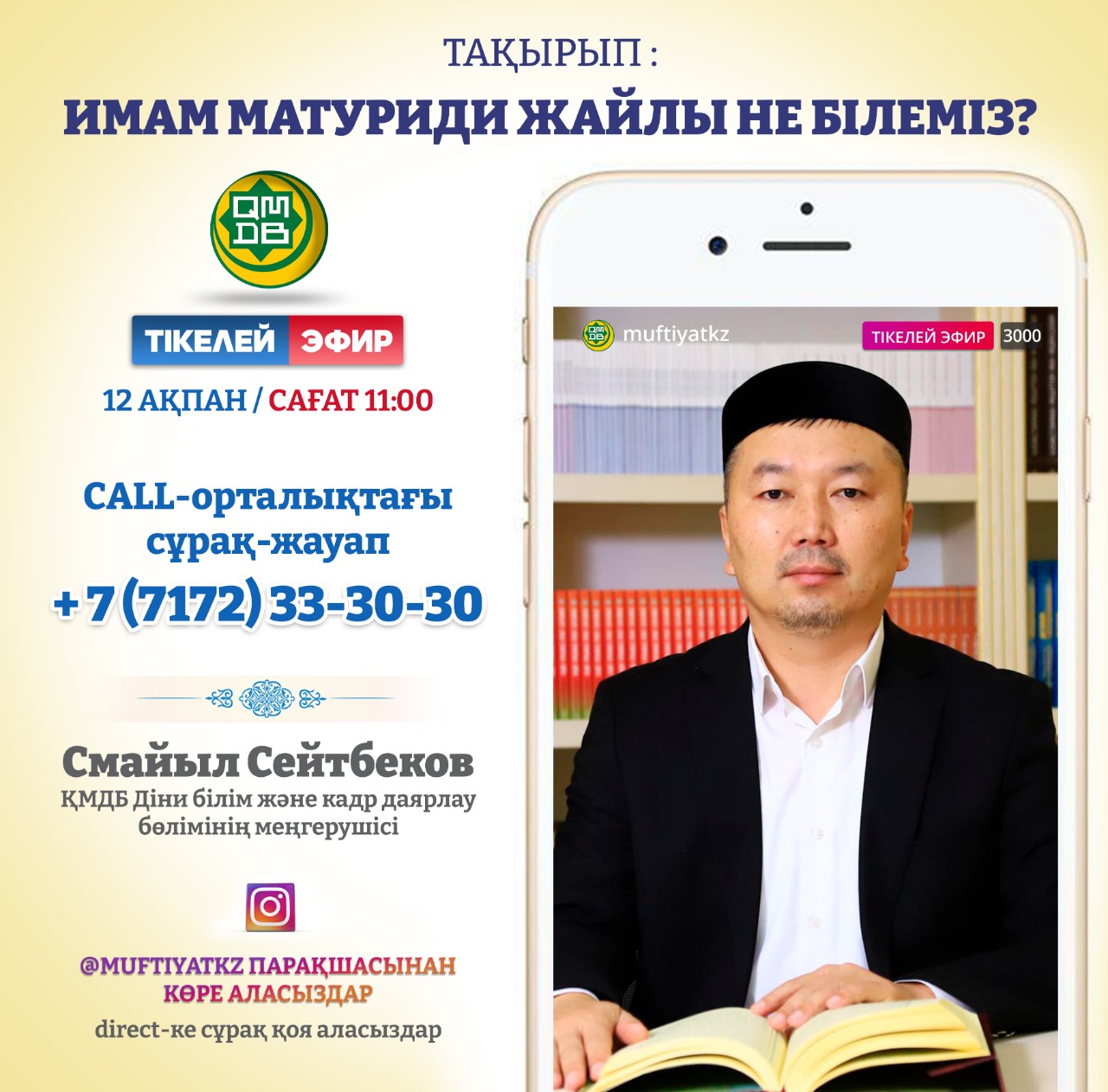 «Вопрос-ответ в call-центре» продолжается и в этом году. Завтра, в 11:00, на вопросы читателей в прямом эфире ответит Смаил Сейтбеков, заведующий Отделом религиозного образования и подготовки кадров, член Совета улемов, исламский ученый.