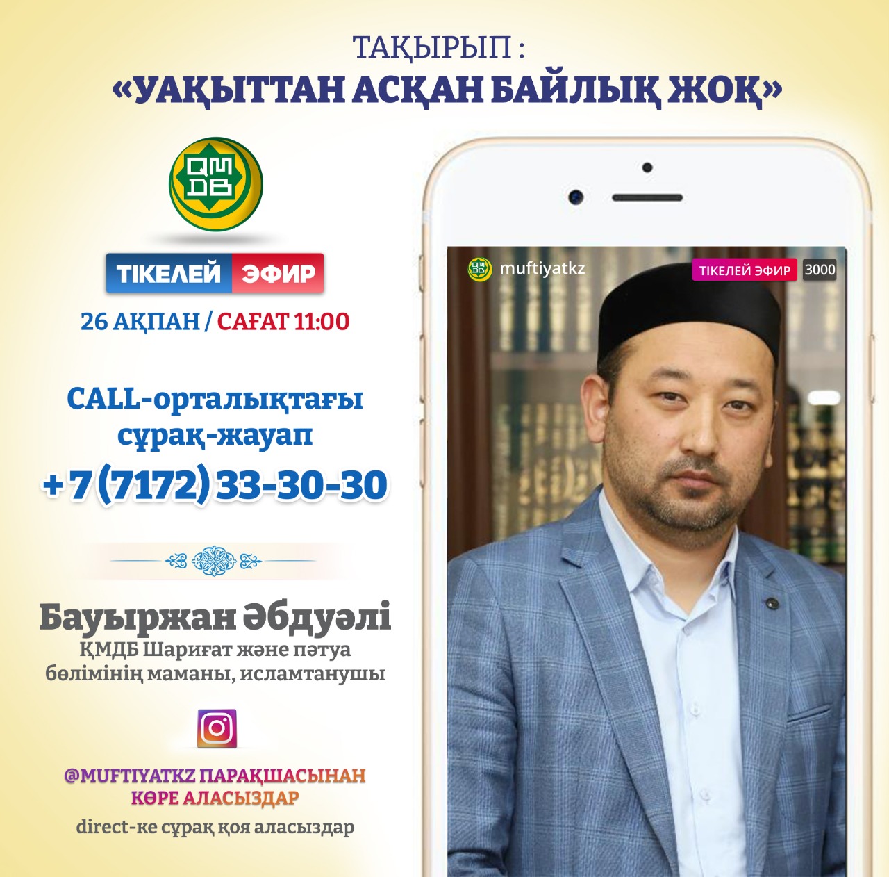 Бауыржан Абдуали, специалист Отдела шариата и фетв ДУМК, проведет беседу о ценности и важности времени и ответит на вопросы. Во время трансляции в Instagram на странице @muftiyatkz подписчики могут отправить свои текущие вопросы, написав в комментариях или позвонив в Религиозно-информационный центр по телефону 8 71 72 33 30 30.