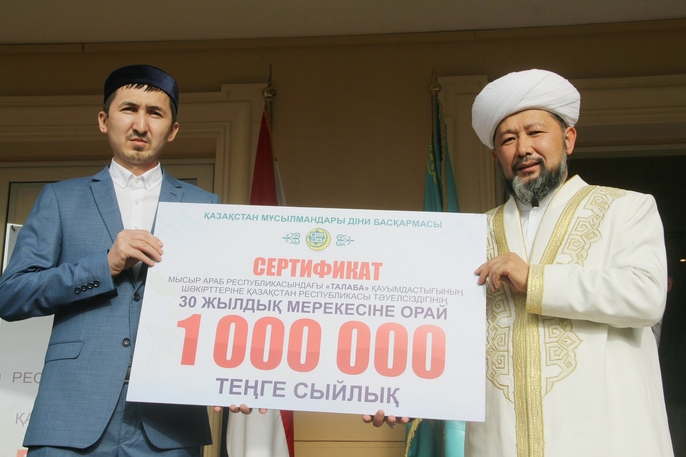 Председатель ДУМК Наурызбай кажы Таганулы во время официального визита в Арабскую Республику Египет передал 1 миллион тенге студентам Ассоциации «Талаба» по случаю 30-летия Независимости.
