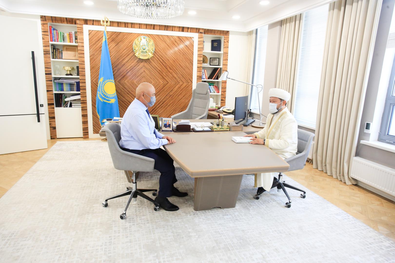 Сегодня находящийся с официальным визитом в Туркестанской области Верховный муфтий Наурызбай кажы Таганулы встретился с главой региона Омирзаком Шокеевым.