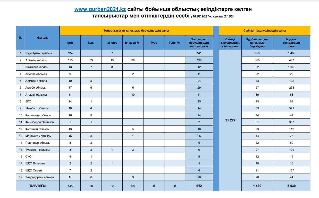 Сегодня, по состоянию на 19 июля, поступило около 6500 заказов на жертвоприношение и заявок на мясо от малообеспеченных семей со всей страны. В частности, на сайте зарегистрировано 31 227 человек, из которых 1460 заказали услугу жертвоприношения, а 5039 – на жертвенное мясо.