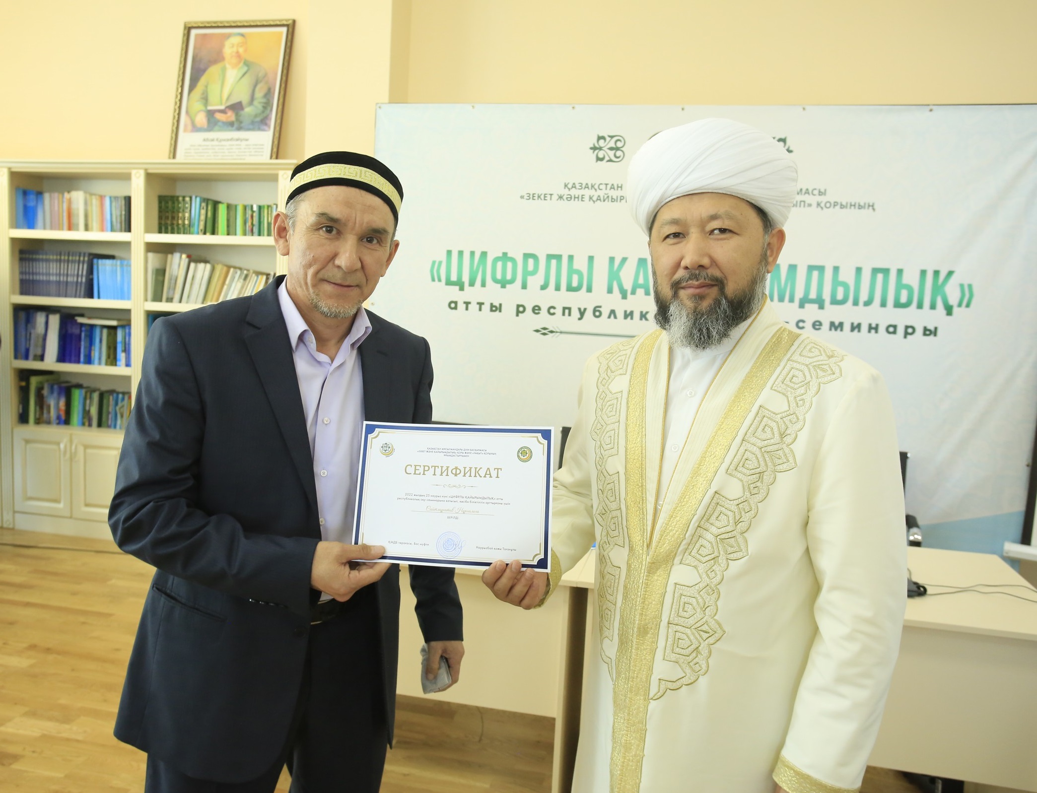 Председатель Духовного управления мусульман Казахстана Наурызбай кажы Таганулы вручил сертификаты участникам республиканского обучающего семинара на тему «Цифровая благотворительность», организованного Фондами «Закят и благотворительность» и «Уакып».