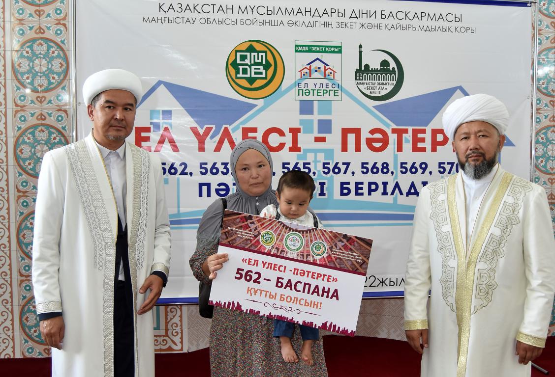 Председатель Духовного управления мусульман Казахстана Наурызбай кажы Таганулы в ходе визита в Мангистаускую область вручил ключи от квартиры 8 семьям. 5 квартир переданы в дар многодетным и малообеспеченным семьям, 3 служебные квартиры предоставлены религиозным служащим, проявивших эффективную работу.