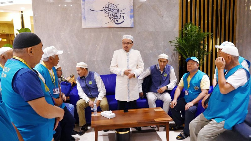 Председатель Хадж миссии Казахстана Ершат Онгар, советник Верховного муфтия Бижигит Нуржигитулы, заведующий Отделом хаджа ДУМК Жандила Бекжигитов, заведующий Отделом проповеди и пропаганды Батыржан Мансуров и другие члены миссии ознакомили паломников с работой миссии и дали подробную информацию о значении священного паломничества.