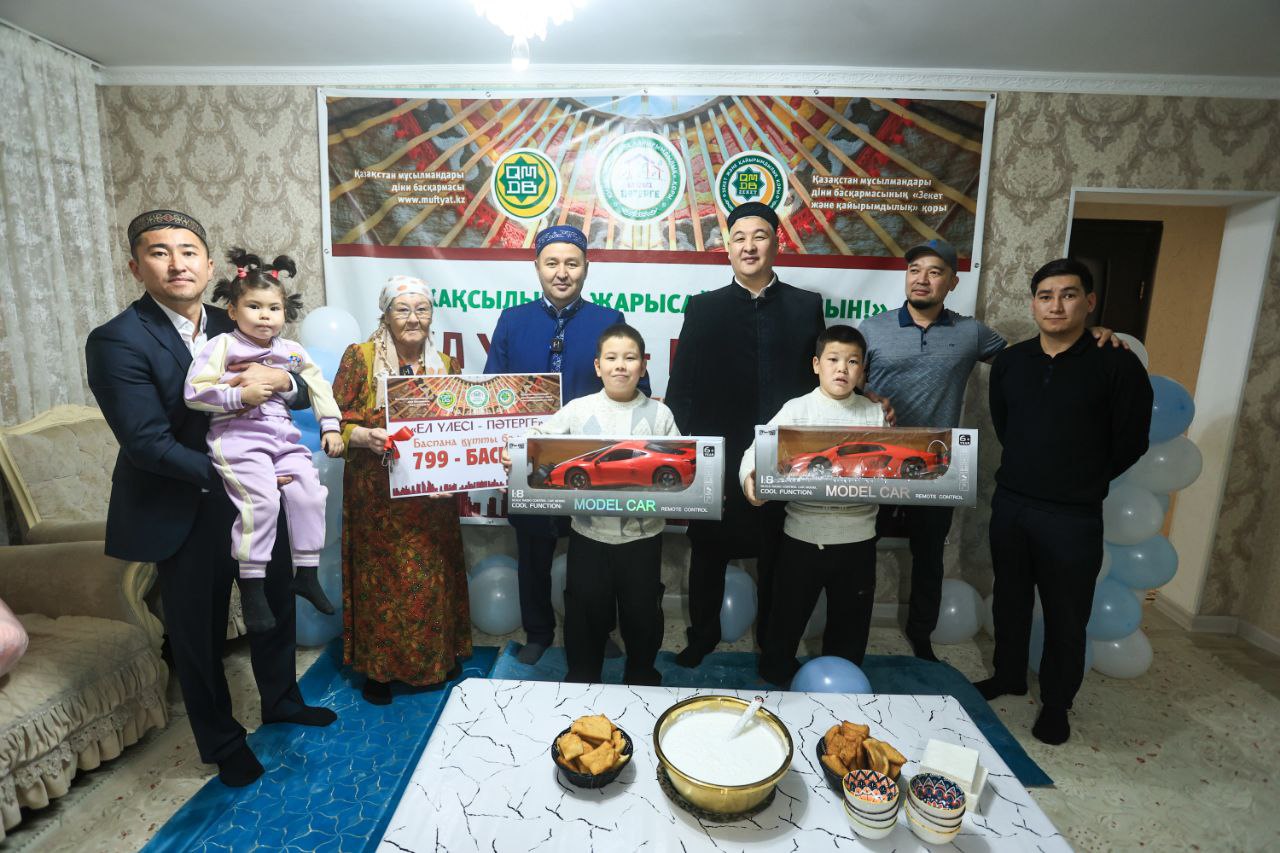 Заместитель председателя Духовного управления мусульман Казахстана, наиб муфтий Кенжетай Байкемелулы вручил ключи 799-жилья Тамаре Дарибаевой в рамках проекта «Ел үлесі – пәтерге» фонда «Закят и Благотворительность» в Мунайлинском районе Мангистауской области.