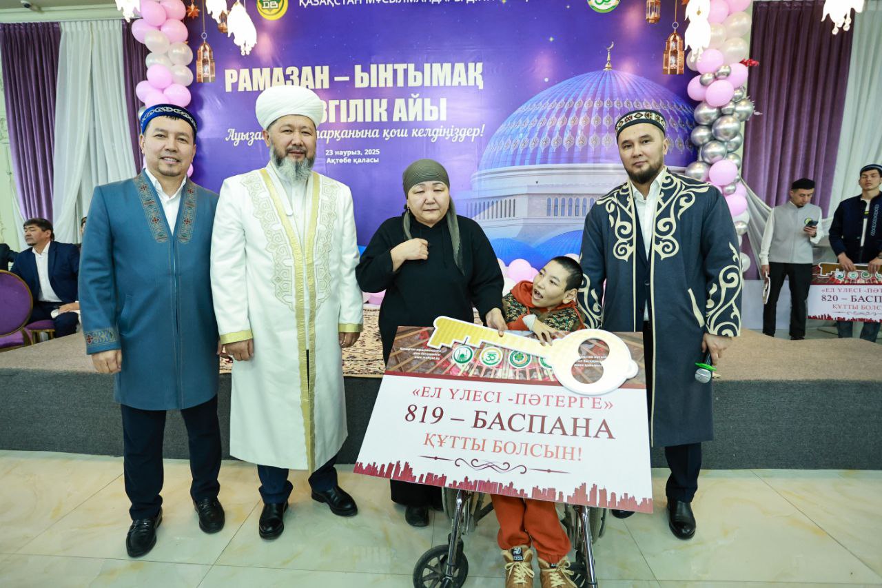 Верховный муфтий Наурызбай кажы Таганулы в рамках прошедшего в Актөбе ауызашара вручил ключи от 819, 820, 821 и 822 квартир в рамках благотворительной акции «Ел үлесі - пәтерге» четырем семьям.