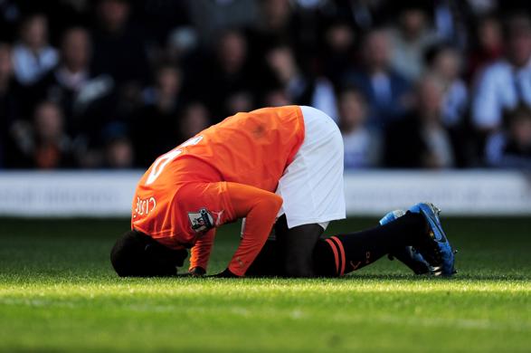 - Паписс Сиссе из "Ньюкасла" совершает поклон на игре с "Вест Бромвич Альбион" в рамках Премьер Лиги 25 марта 2012 года.