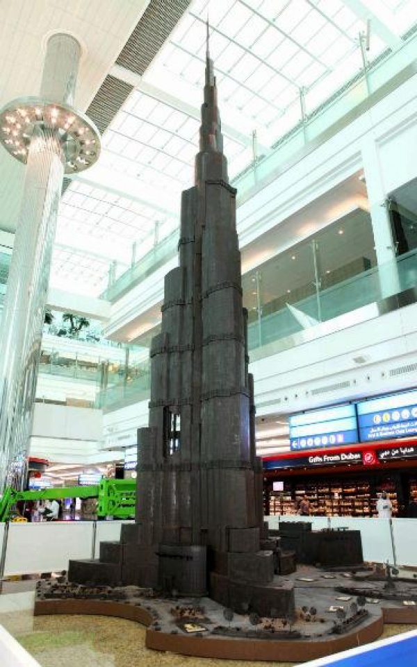 Самое высокое в мире сооружение из шоколада – 13,5 метровая копия высочайшего небоскреба в мире Бурдж-Халифа – появилось в международном аэропорту Дубая вчера. Шоколадную башню создал мастер-шоколатье Эндрю Фарругия.