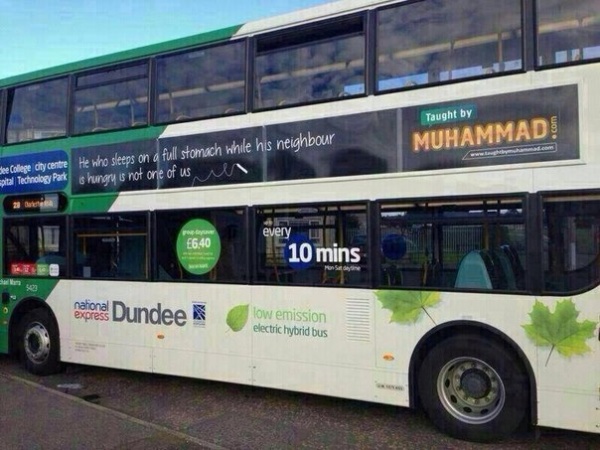 В эпоху страха под воздействием глобальной нестабильности, мусульмане в восточном городе Шотландии Данди начали новую рекламную кампанию на автобусах, чтобы изменить неправильные представления общества о своей вере. Слова Пророка Мухаммада (с.а.в.) «Тот, кто спит на полный желудок, в то время как его сосед голоден, - не один из нас» были помещены на снаружи на автобусах National Express Bus.